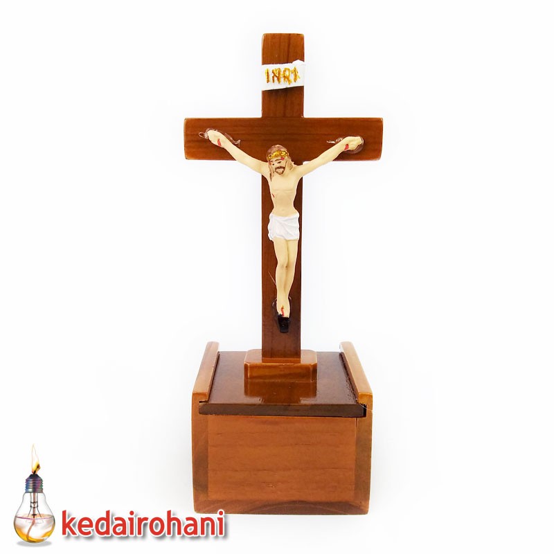 Name: Salib Duduk Meja Kayu Dengan Kotak Rosario Benda Rohani Corpus Patung Yesus Inri Fiberglass 17 Cm