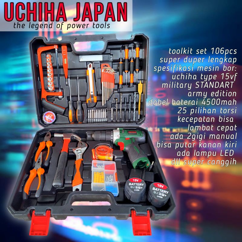 Silhkan pilih variasi Toolkit besar uchiha 102 pcsToolkit besar Hyuga 102 pvsTolkit mini + bor corodess 15v fullset dpt 2 koperToolkit mini + bor cordless 12v fullset dpt 2 koperTool & kit full set sesuai foto.Harga normal sebelum promo 1.050.000.-Harga promo sangat murah.Kelengkapan sangat komplit.Ada tang banyakKunci banyak PaluKunci L banyakKunci bintangObeng + dan - banyak typeMeteran . Cutter full setTespen electronic dengan layar digital banyak lagi. Dapatkan Hadiah spesial sarung tangan kerja. Klo beli di kami...#toolkit #kuncil #tang #obeng #karter