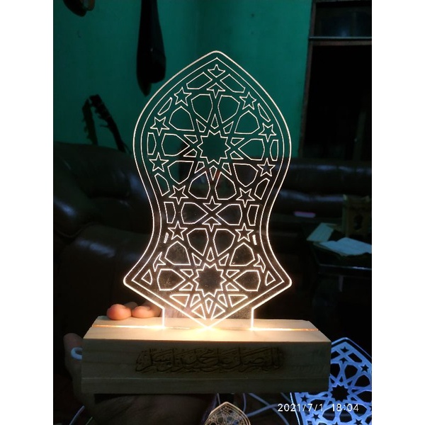 assalamu'alaikum -bahan akrilik tebal 2 mm-kayu tines-tinggi 20 cm-sudah ada lampu *belum ada adaptor semoga bermanf