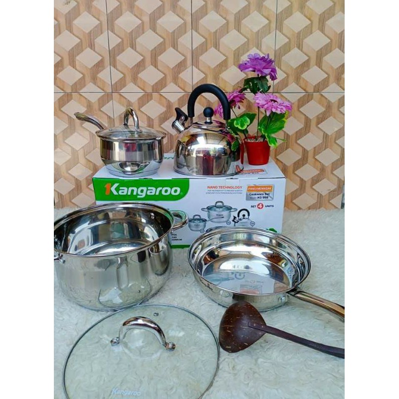 Kangaroo Stainless Steel set of 6Set panci dengan material stainless steel kualitas premium yang lengkap dan pas untuk kebutuhan memasak harian Anda.Dengan tampilan elegan dan bahan berkualitas tinggi, sehingga memasak lebih mudah dan dapur makin mewah.1 set terdiri dari:- Sauce Pan, Diameter 16 cm dengan Tutup Kaca - Dutch Oven, Diameter 24 cm dengan Tutup Kaca - Fry Pan, Diameter 24 cm- Teko, Kapasitas 2.5 liter- FREE Sendok & Spatula KayuKenapa harus Kangaroo Stainless Steel set of 6?- Material Stainless Steel 304- Cepat panas- Tanpa zat karsinogen penyebab kanker - Bebas PFOA - Timah dan Cadmium - Teknologi NANO membantu permukaan lebih tahan gores - Lapisan bawah 5 layer dengan teknology tinggi (Inox, Aluminium, Metal, Aluminium & Inox 340) - Penutup yang disertai dengan lubang steam/uap membuat makanan anda cepat matang dan terbuat dari lapisan kaca memudah anda untuk melihat keadaan makanan dari luar. - Dapat digunakan untuk semua kompor (Termasuk Kompor Induksi)#tekostainlessset#wajanstainlessset#kangaroostainlessset#pancistainless#pancistainle