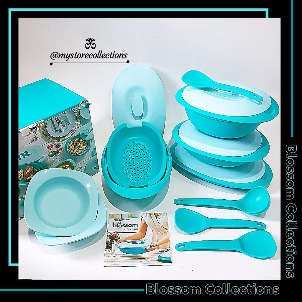 Blossom Collection SetUkuran :a. Blossom Oval Server with Colander & Spoon : 1.8L/ 32.3 x 20.5 x 10.3 cmb. Blossom Serving Platter : 600ml/ 32.3 x 20.6 x 6.5 cmc. Blossom Soup Server with ladle : 1.8L/ 28 x 20.6 x 11.7 cmd. Blossom Saucy Dish : 1.1L/ 28.3 x 20.6 x 9.1 cme. Free: - Blossom Bowl (2)- Booklet & Gift boxMelengkapi piranti saji nuansa turquoise di rumah Anda, Tupperware menghadirkan Blossom Collection dengan warna baru. Makin cantik dan mewah jika disandingkan dengan ragam wadah saji lainnya berwarna senada dari Tupperware. Buat sajian jadi makin istimewa dan tak dapat dilupakan pake Tupperware Blossom Collection warna baru ini. Sajian lengkap dalam berbagai ukuran wadah dilengkapi dengan spoon serta ladle. Yakin mau melewatkan koleksi menawan yang satu ini?Berikut keistimewaan Blossom Collection:•Fungsi 3 in 1. Selain untuk penyajian, juga untuk penyimpanan makanan dalam kulkas (fridge) dan sekaligus dapat langsung menghangatkan makanan dalam microwave.•Bentuk dan ukurannya berbagai macam, baik untuk masakan gorengan, tumisan, ataupun berkuah.•Wadah dilengkapi pegangan untuk memudahkan mengangkat atau memindahkannya.•Masing-masing wadah dilengkapi dengan spoon dan ladle. •Sendok yang dapat ditempelkan pada cover, jika sedang tidak digunakan.NB : MOHON TANYAKAN KETERSEDIAAN BARANG TERLEBIH D